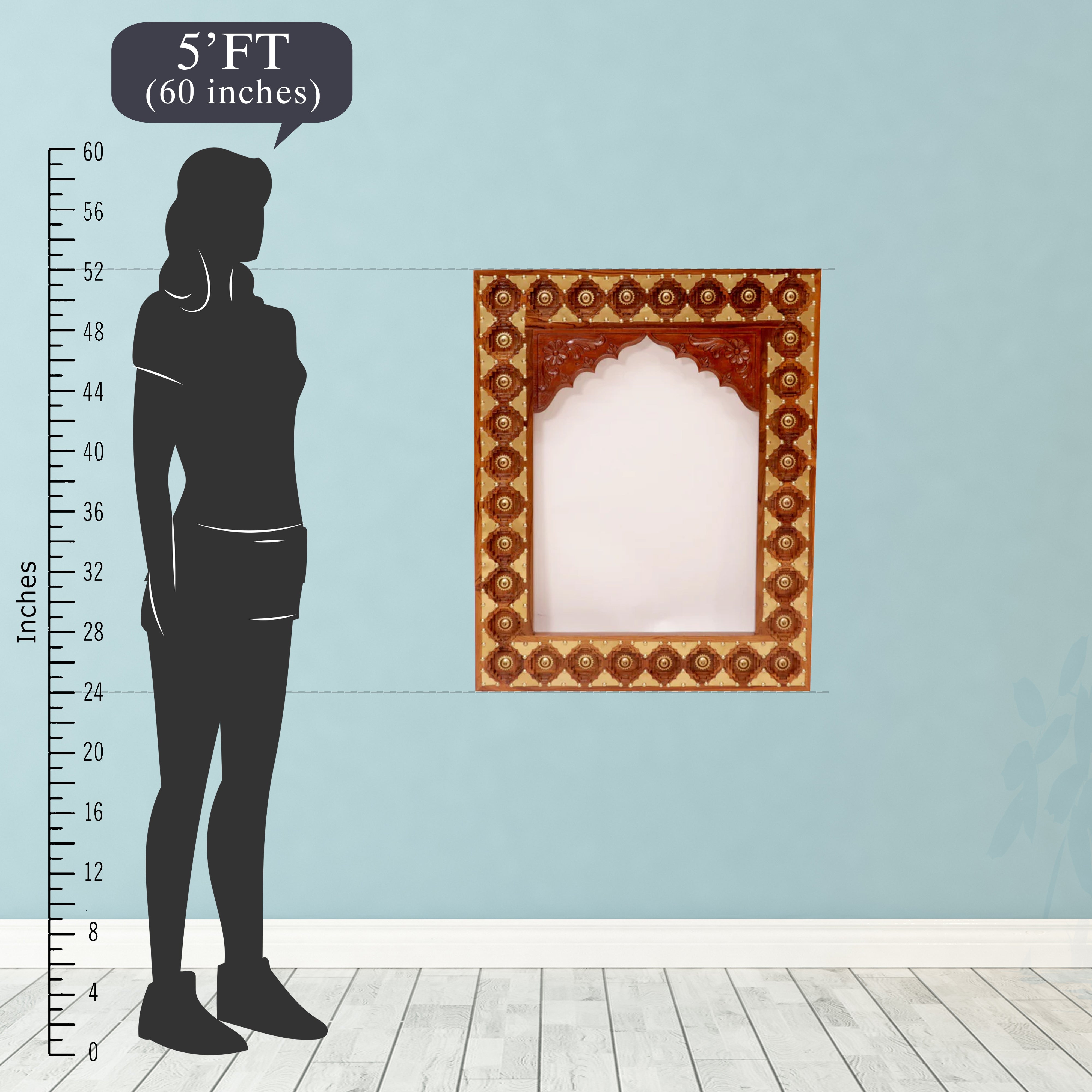 This exquisite wall mirror is made from solid brass and teak wood, giving it a classic and refined appearance. Its intricate carved detailing adds a touch of elegance to any room. The versatile design allows you to hang it either horizontally or vertically, depending on your personal preference. Crafted with high-quality materials, this mirror is built to last and maintain its beauty over time. It adds depth and dimension to your home decor, becoming a captivating focal point.