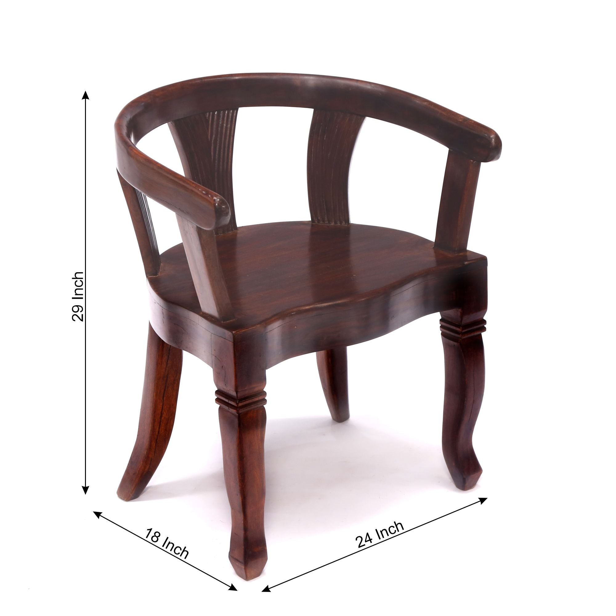 This Sheesham wood chair features a stylish and modern design with rounded arms in a dark tone. Crafted from high-quality materials, it ensures durability and longevity. The chair is ergonomically designed to provide maximum comfort and support. With its elegant appearance, it adds a touch of sophistication to any room or space. Additionally, its versatility allows it to be used in different settings, such as dining rooms or offices.